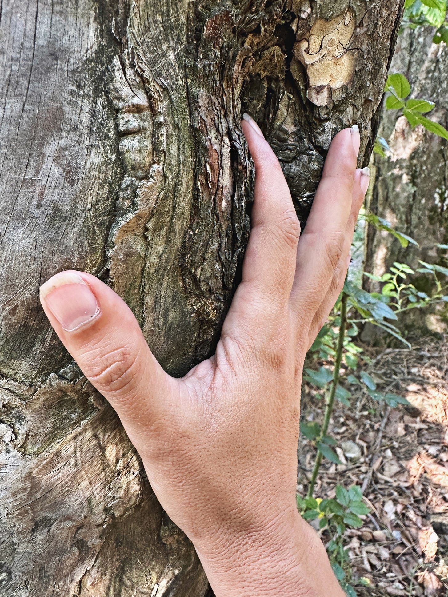Once I reach the row of pines, one in particular catches my eye. The closer I come the stronger she feels, even though she is the slimmest of the bunch. Suddenly I feel myself collapsing into her, into an embrace. It happens so fast, that at first I don’t realise there is a rosehip bush right behind her, to which I am now also holding on a little too tight. The thorns pierce the soft and supple skin of the inside of my arms.