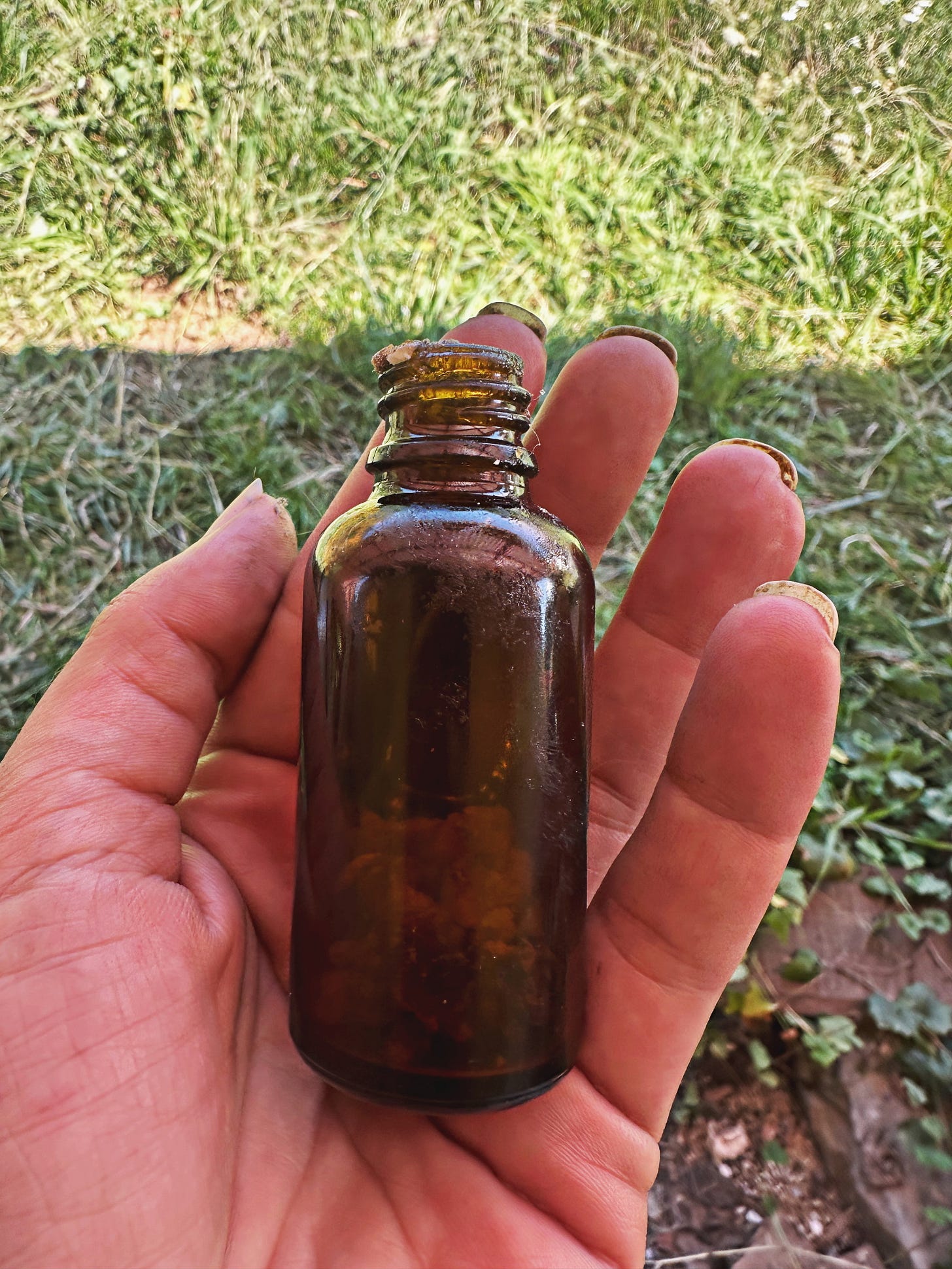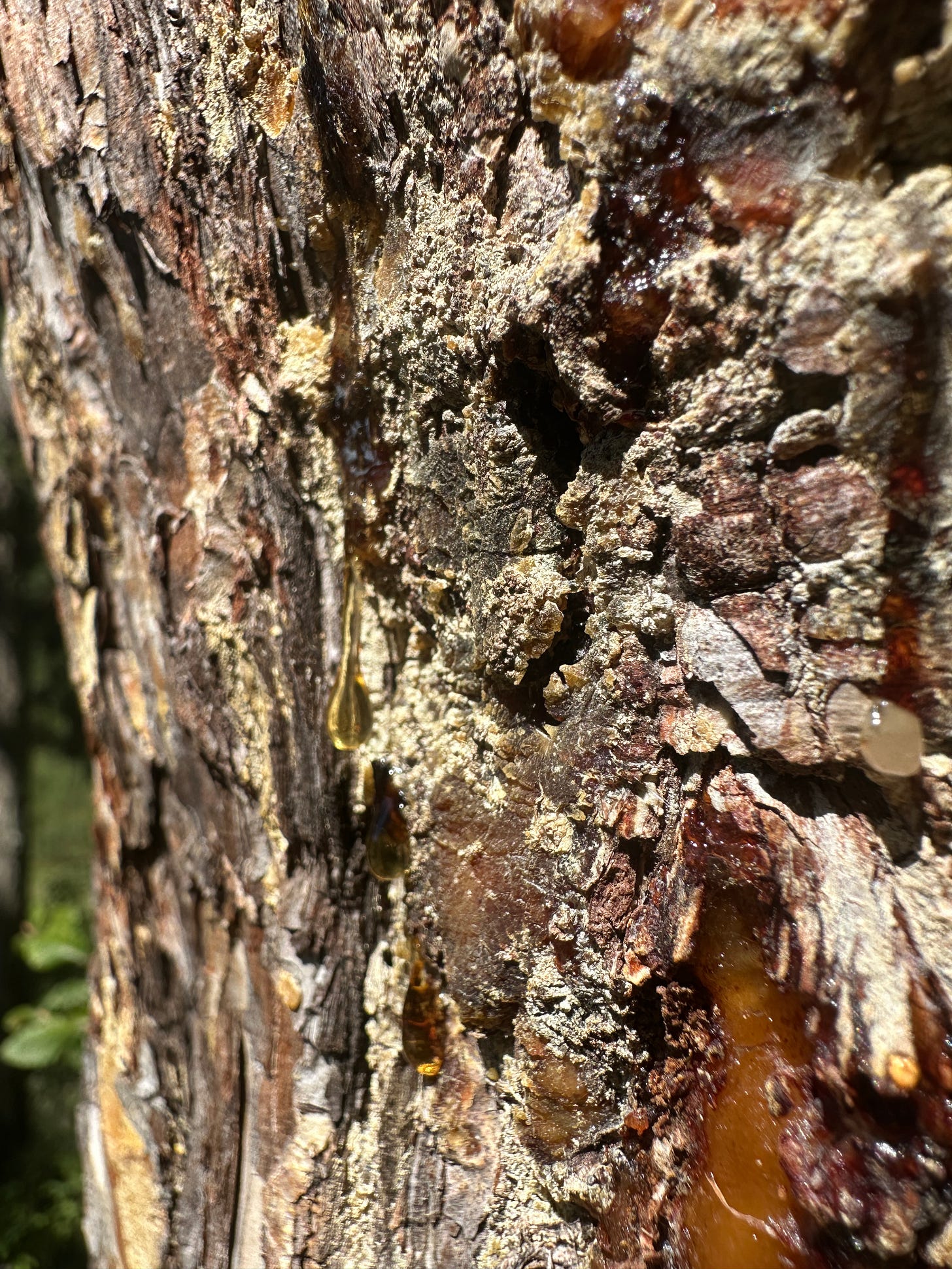 I run back to the house and return with a small glass apothecary bottle. As gently as I can I start scraping of some resin. I feel I need to have her scent at hand for future meditations. I will make a simple tincture:
